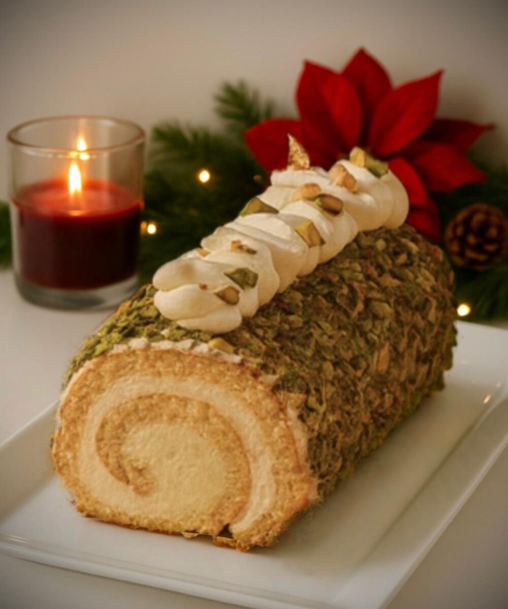 Bûche roulée chocolat blanc pistache
