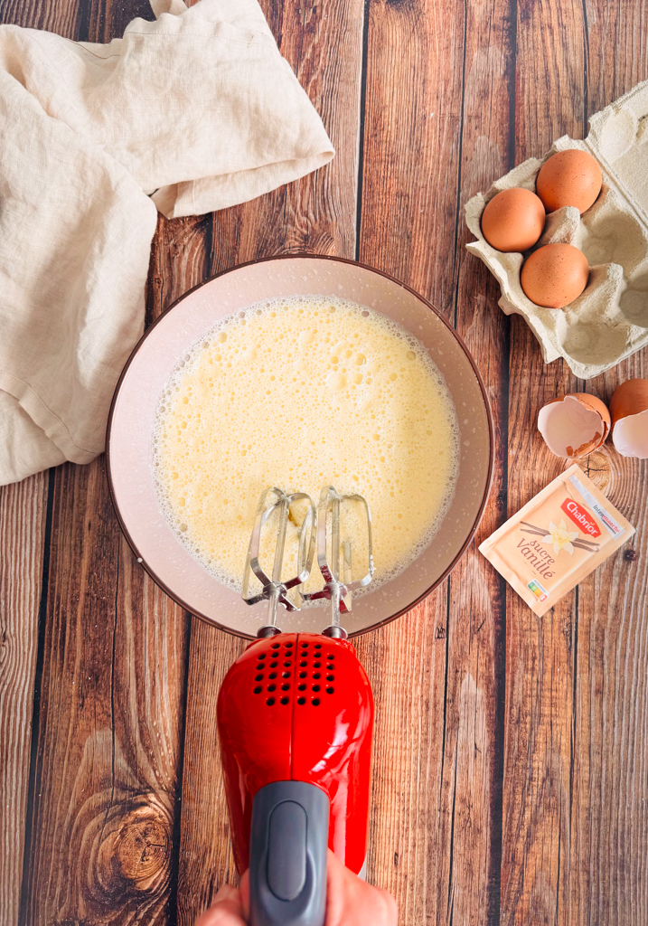 - Dans un bol, mettre les œufs, le sucre et le sucre vanillé.