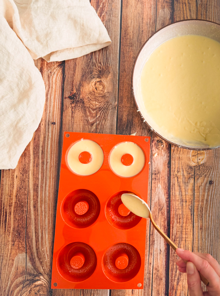 - Graisser vos moules à donuts et les remplir de pâte jusqu’au tiers;